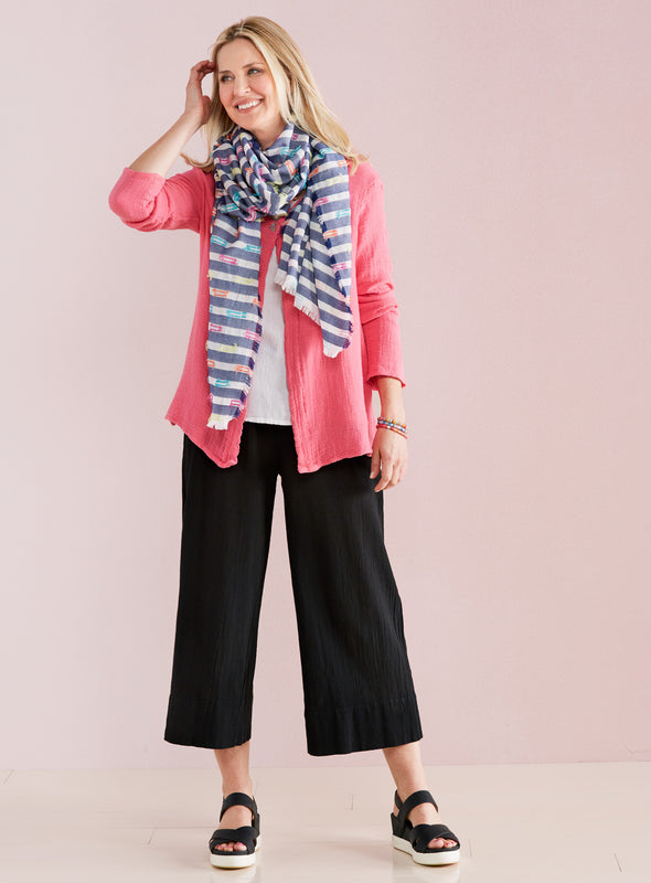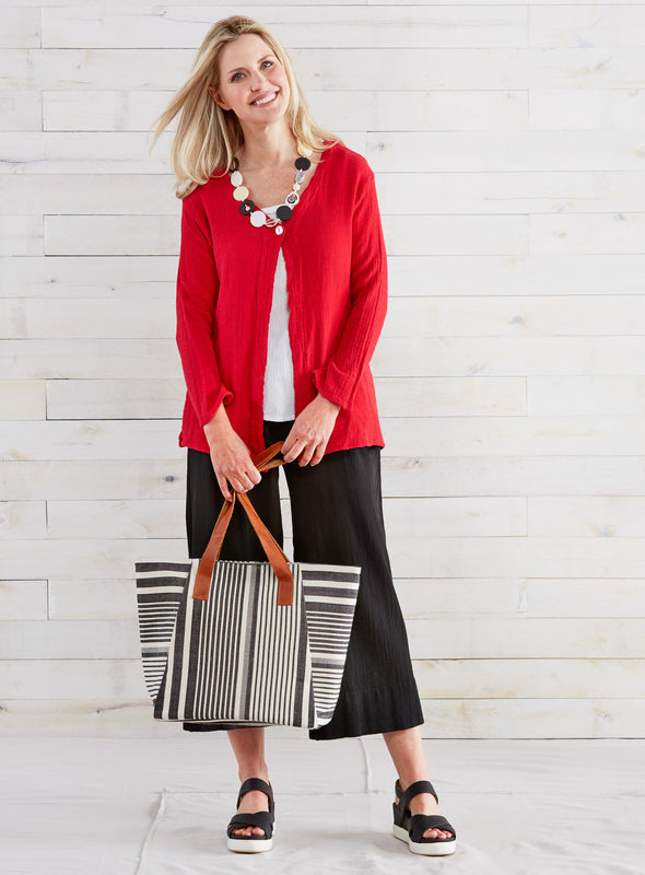 Remember to double the garment measurement if you want to compare it to your body measurements. And consider how loose or fitted of a look you’re going for. For example, if your bust is 38" around and a garment is 20" across at the bust, that gives you about 2" of ease. Garment measurements may vary up to a half inch due to the nature of the fabric.