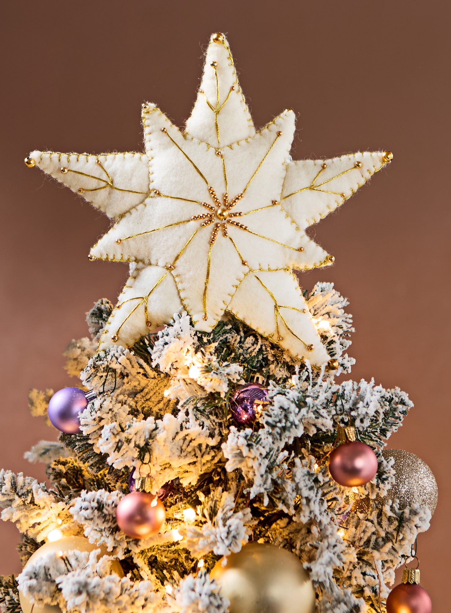 Metallic embroidery and tiny beads trace each point on this hand-felted star Christmas tree topper, catching the light with a warm coppery glow. Artisans in Nepal hand-felt and stitch each one—a connection to the region’s longstanding felt crafting traditions. A slot at the base of the star makes it easier to perch than traditional wire cone tree topper styles. Plus it’s light enough to nestle into tree branches or display on a mantel as a symbol of winter’s magic.