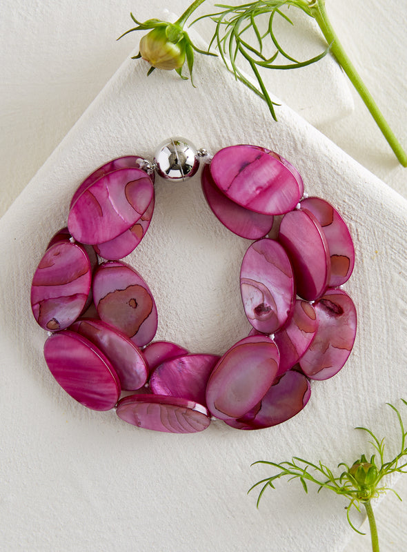 Smooth mother-of-pearl ovals shimmer ever so slightly as they catch the light, but the real magic of this statement necklace is in the magnetic clasp. Easy on, easy off, no fumbling, and no tangled strands. Want more length? Connect the matching, magnetic clasp bracelet to create a dramatic, opera-length strand.