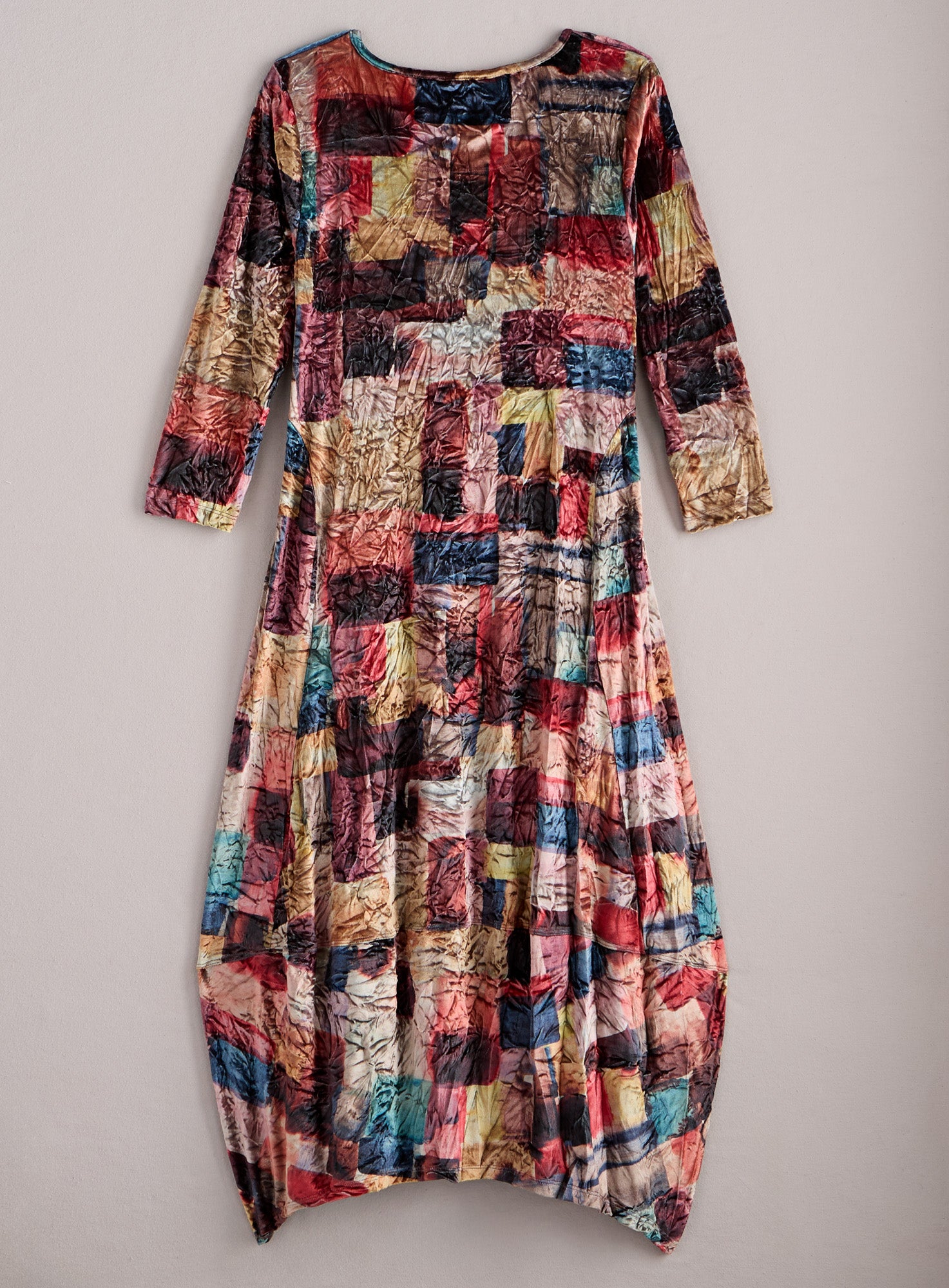 This isn’t your everyday dress—but it’s so easy to wear that it could be. Digitally printed crushed velvet shines from every angle, in a mosaic of shades from rust to coral, teal to turquoise, and golden yellow that looks amazing with gold jewelry. The 3/4 sleeves and softly tulip-shaped hem flatter without fuss, while the ultra-stretchy fabric makes it so inviting to wear.