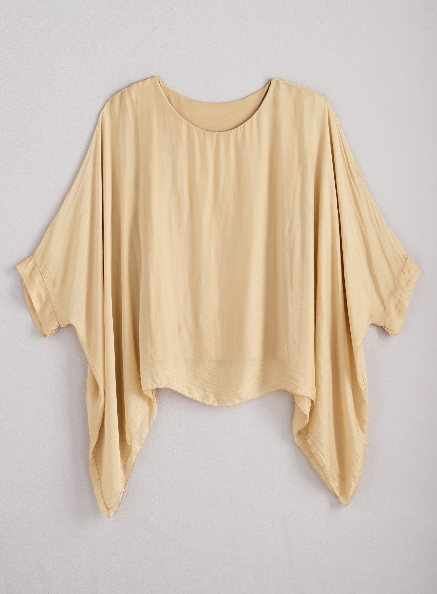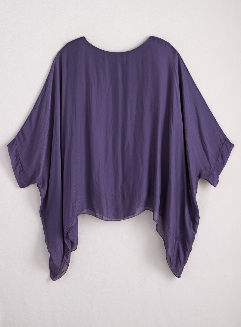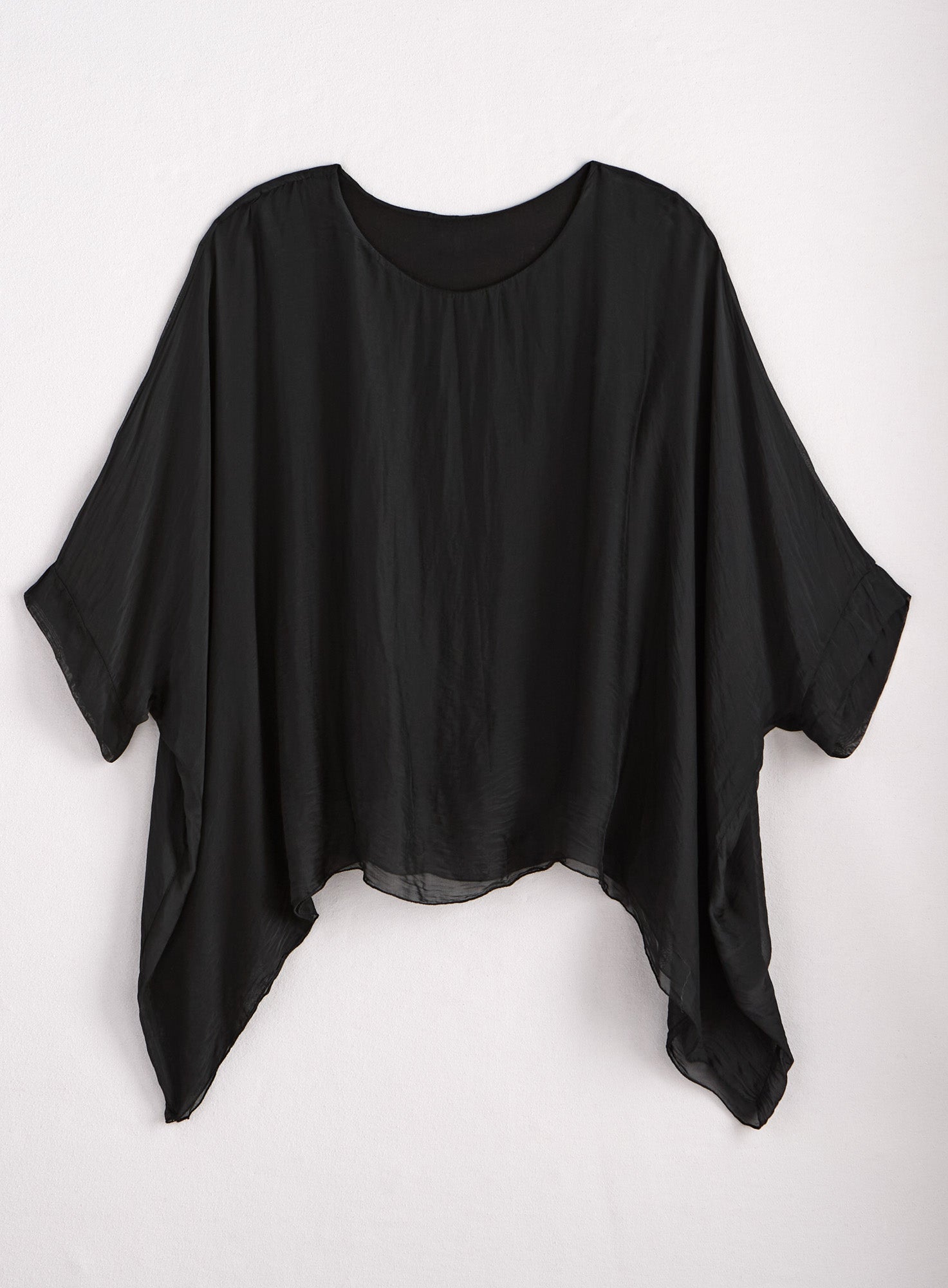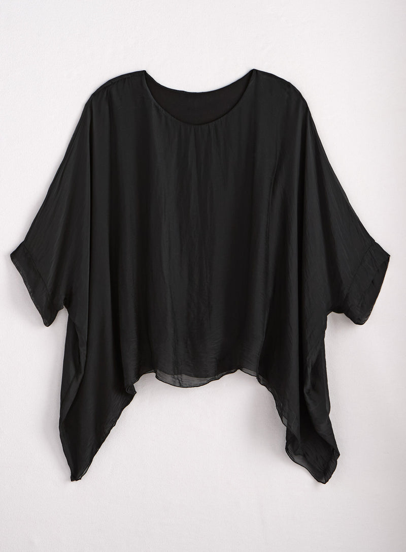 Do you believe in magic? Silky woven fabric with a stretch-knit base layer conjures silhouettes that are quietly dramatic and dressy-comfy. Made in Italy in one size–styling, these pieces are a special addition to your wardrobe, whether you mix, match, or go monochrome. This dreamy top combines a flowing, poncho-like layer of woven viscose/silk with a stretchy tank lining made of viscose with elastic. Because you can’t be enchanting if you can’t get comfortable. Features a round neckline and handkerchief hem that dips extra low on each side.