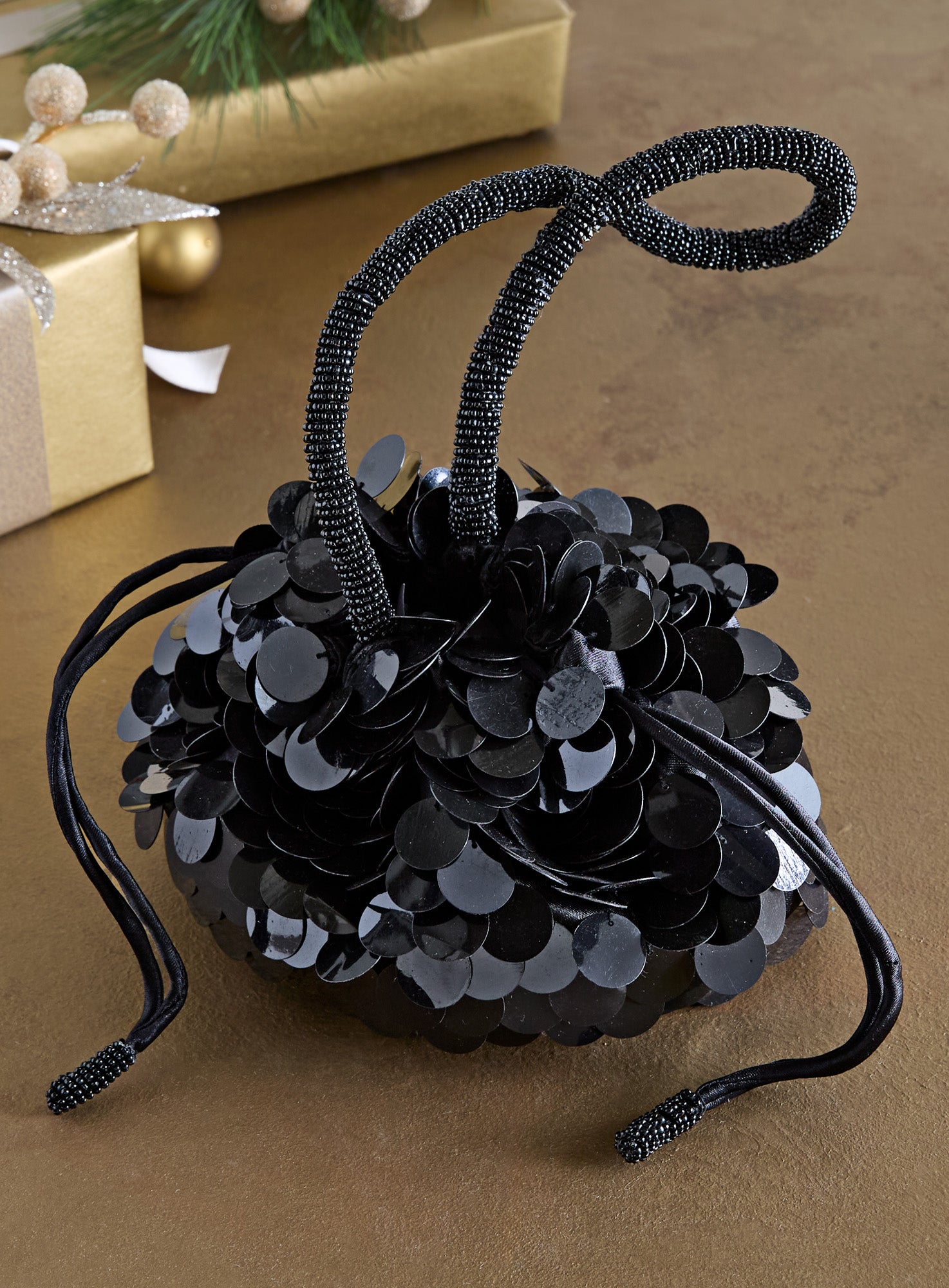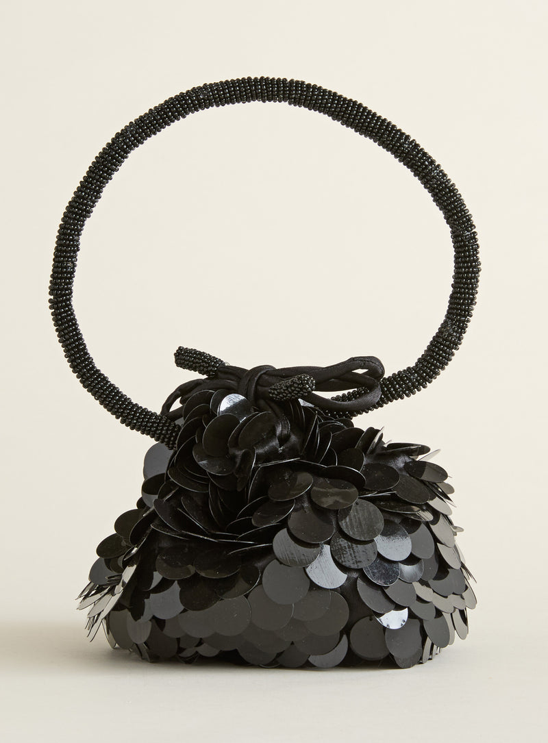 Sometimes what your outfit needs is a little drama. This compact evening bag dazzles with layers of black sequins that shimmer like stage lights on opening night. Features a sculptural beaded handle, soft satin base, and drawstring top for a playful, vintage flair. Designed for just the essentials: lipstick, keys, and a dash of mischief.