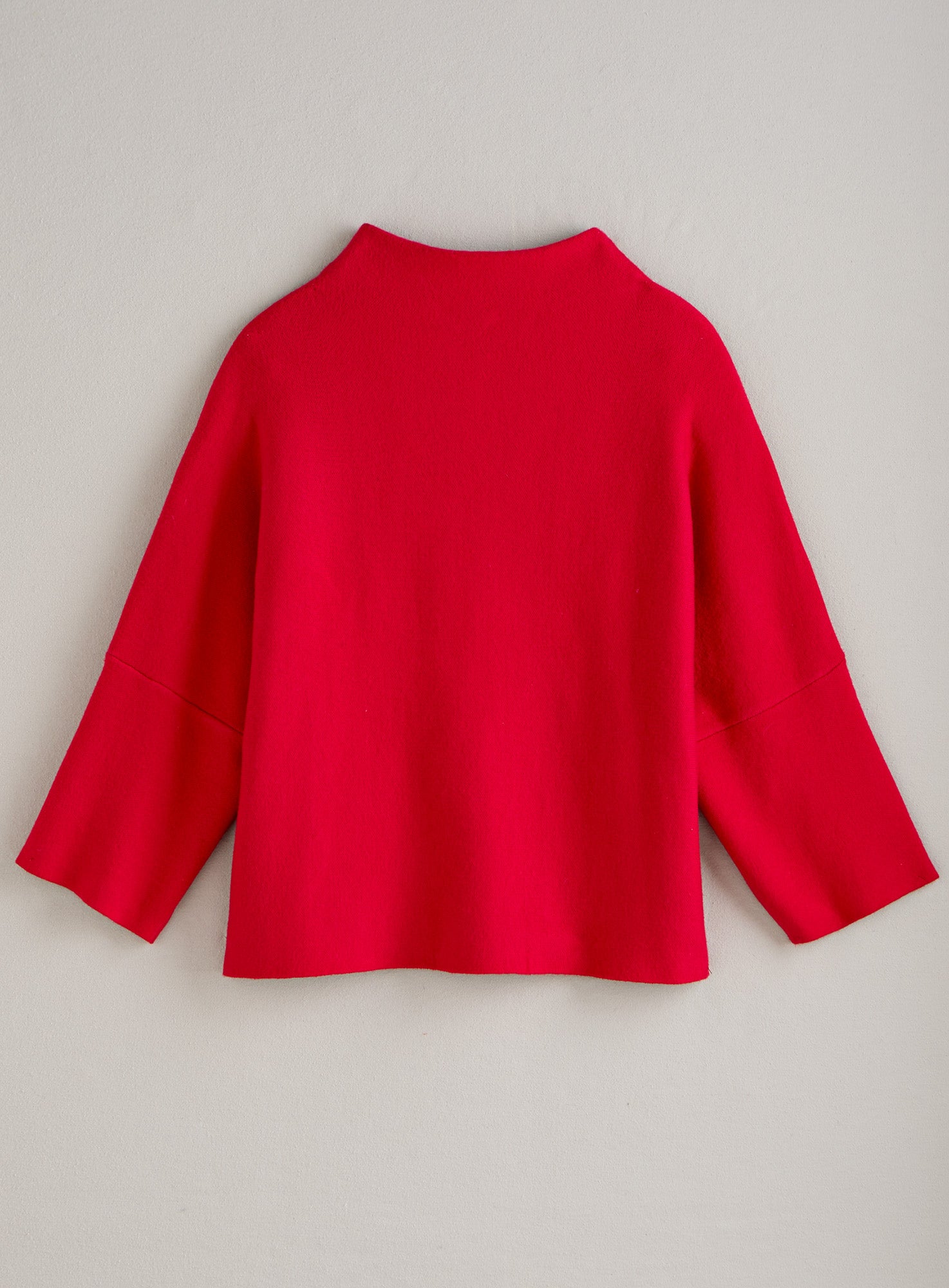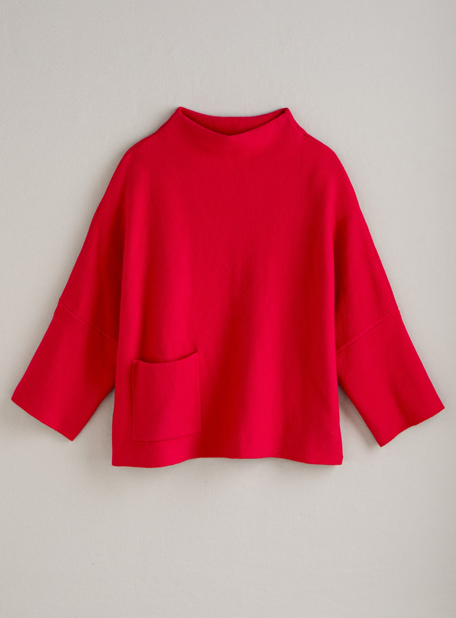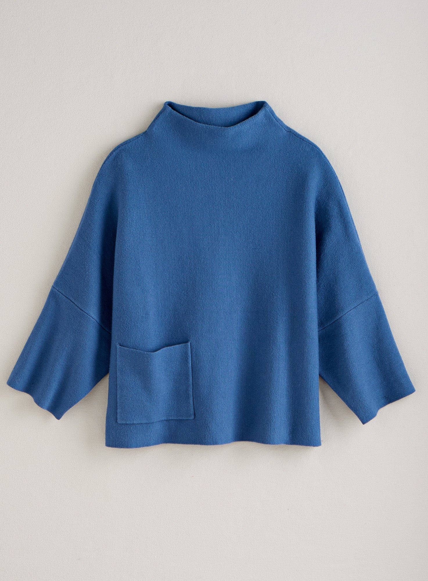 Soft, inviting, and almost sculptural, this relaxed sweater is easy to wear but never boring. A subtle funnel neck, deep drop-shoulder 3/4 sleeves, and a single patch pocket are sophisticated details that elevate the look. At 23" long in size L, it hints at the on-trend cropped look but hits comfortably at the waist. Next time you’re tempted to reach for a sweatshirt, pop this on instead and see if your day doesn’t start feeling much more chic. Made from a smooth and cushiony viscose/poly/nylon blend.
