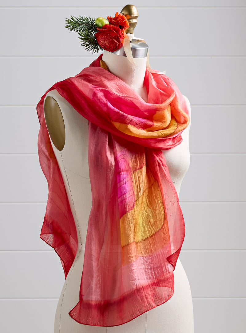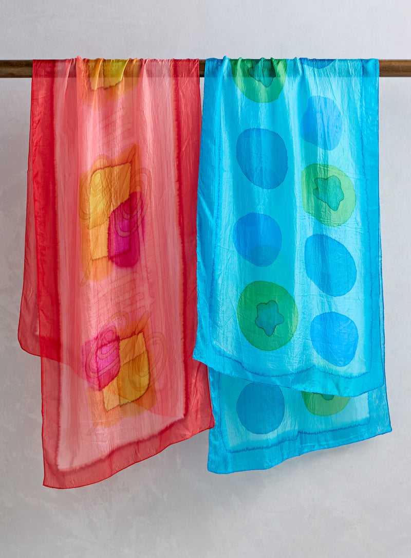 This hand-printed silk scarf is art in motion. Textile artists in India take an expanse of pure silk and bring it to life using vivid fabric dyes that flow like watercolor paint. Choose Turquoise with teal and green, or Red with layers of coral and golden yellow. Though the designs remain similar—Turquoise will always be circles, Red will always be rectangles—no two are exactly alike. Silk naturally captures and reflects body temperature, insulating when you’re cool, breathable when you’re hot, making this scarf an all-season accent.
