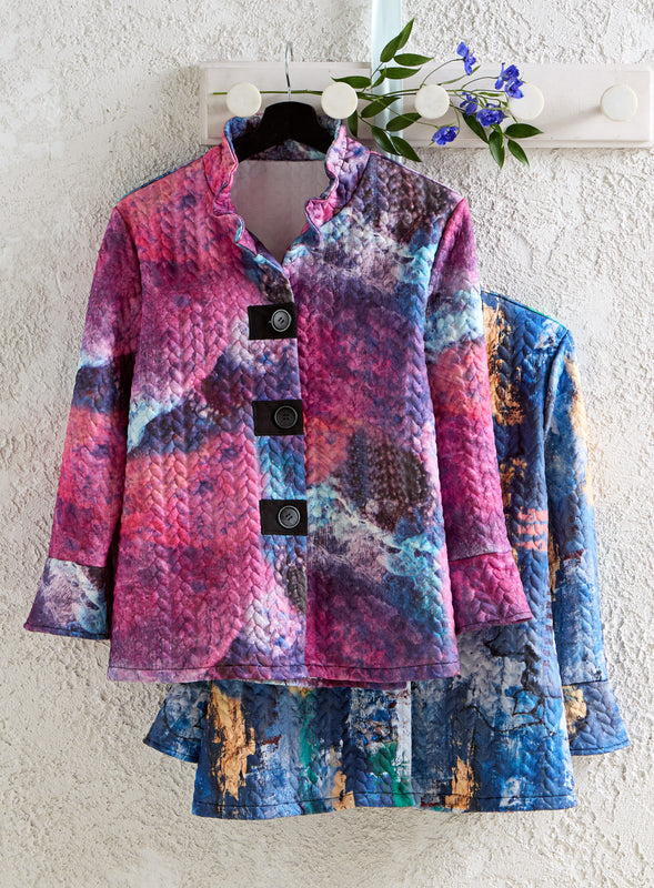 This semi-sheer woven poly scarf captures the look of hand-marbled paper—drifting curls of pigment that echo but never repeat. Light and soft, it packs small and drapes easily to add a quick swirl of color.