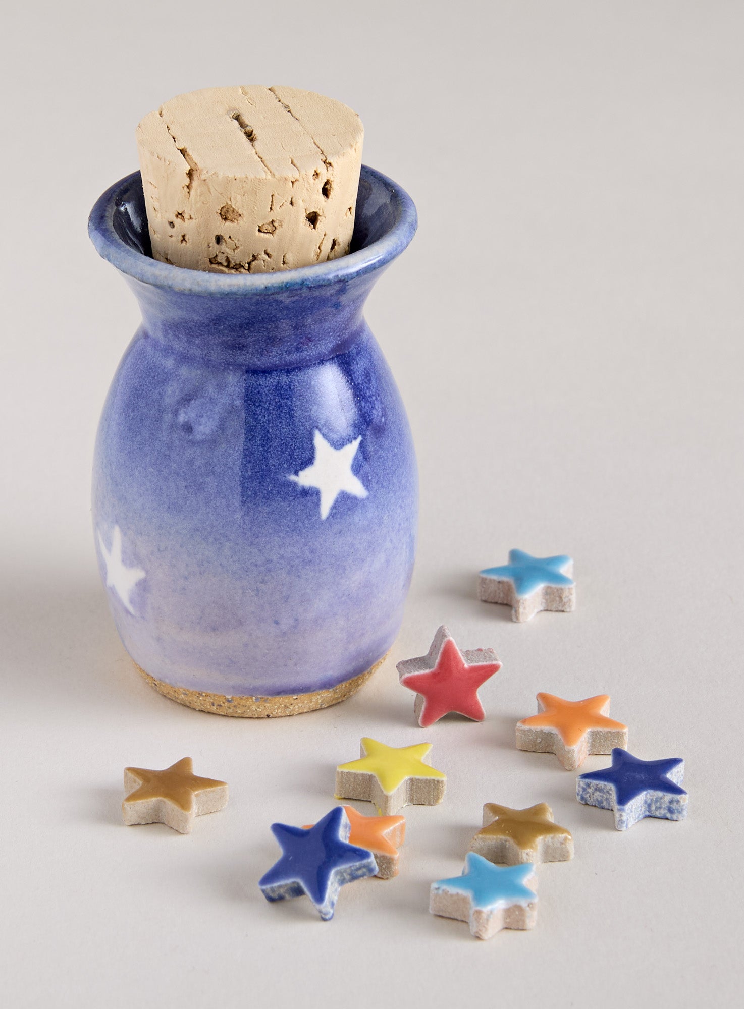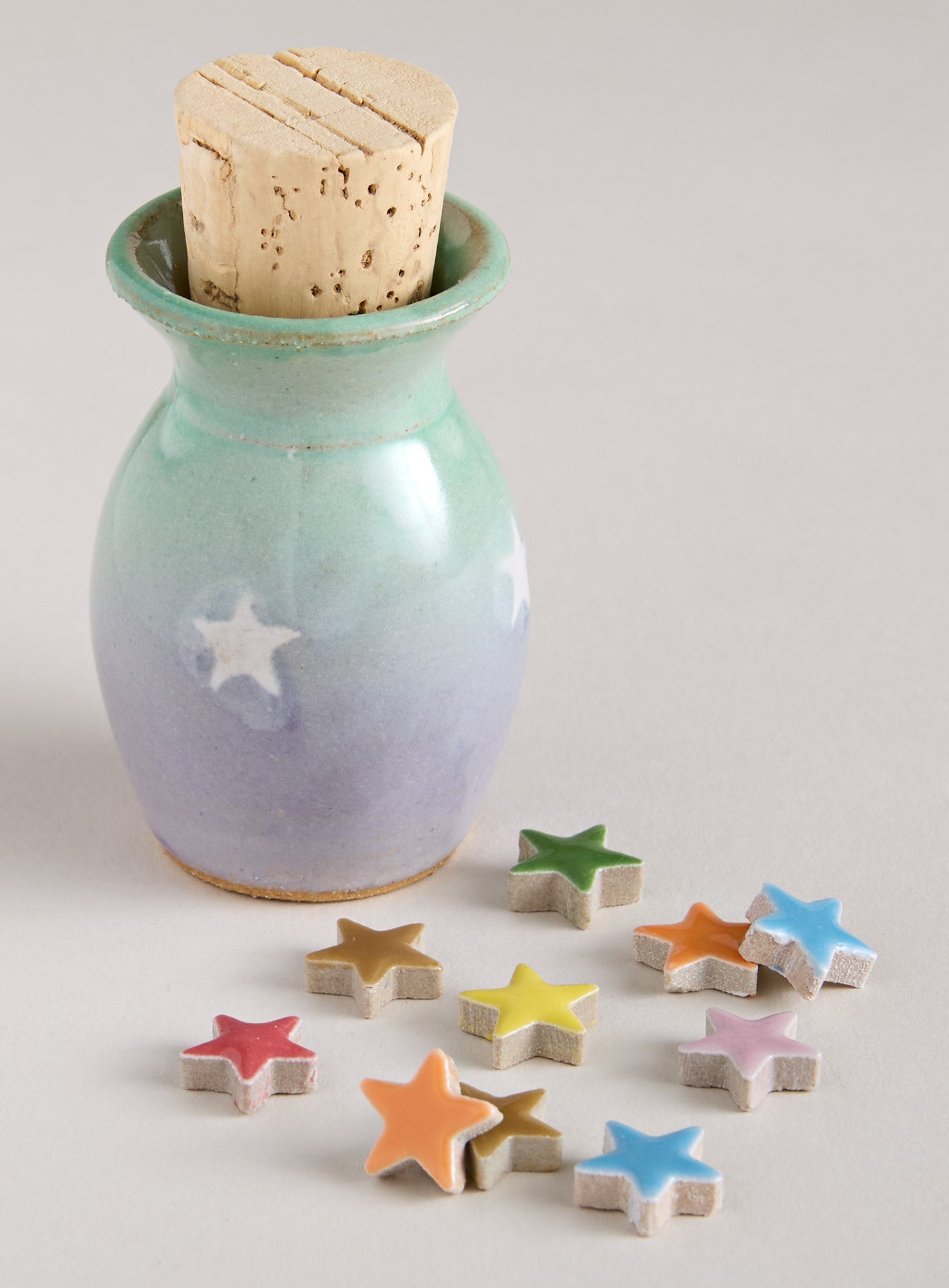 This charming ceramic jar reminds us that good things add up. Handmade in New Hampshire with star motif and a cork stopper, this petite jar comes filled with twelve tiny ceramic stars—each one an invitation to pause and notice something worth appreciating. Drop in a star for a small win, a kind moment, or in gratitude for a day where everything went right.