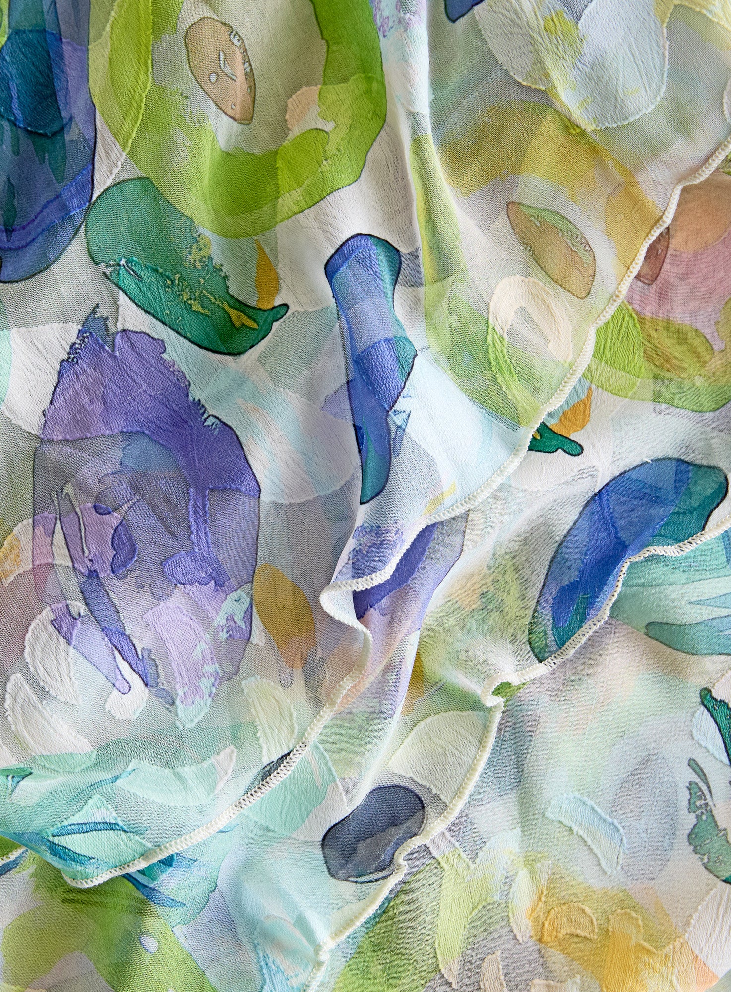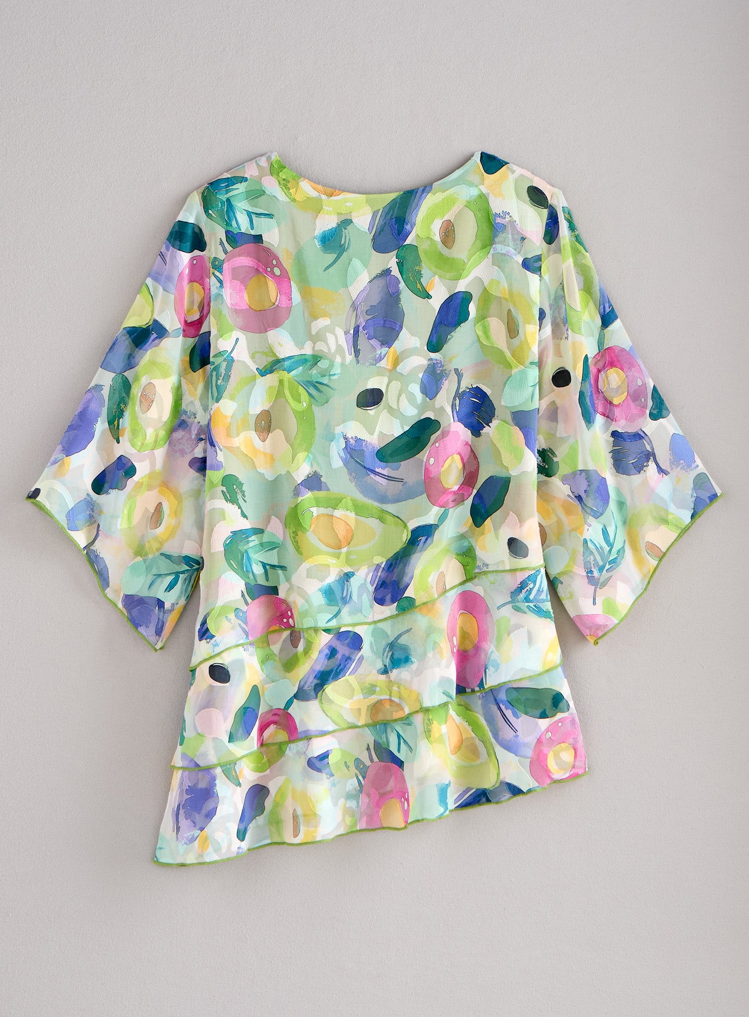 Soft layers, pastel greens, and fresh floral color give this pretty top an unmistakably spring-forward feel. Angled tiers of semisheer woven poly float atop a stretchy rayon/poly knit lining that covers comfortably to just above the waist. Within the print, raw-edge stitching in leafy shapes add depth and texture. The tiers are finished with serged stitching that adds a wavy little flutter. The 3/4-length sleeves stay unlined to keep the look light and airy.