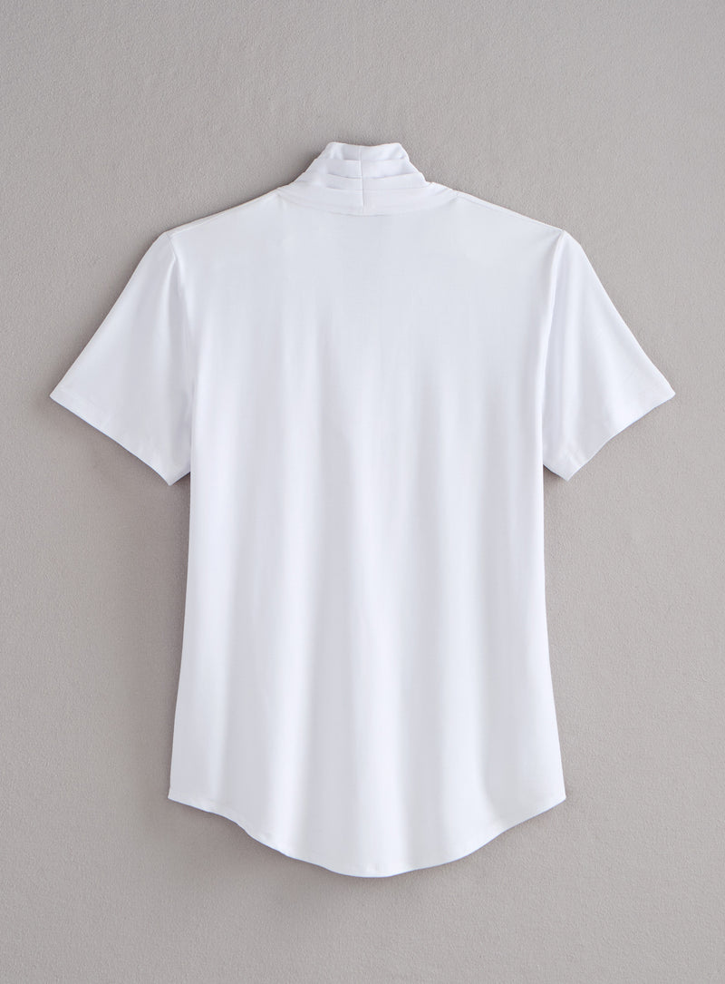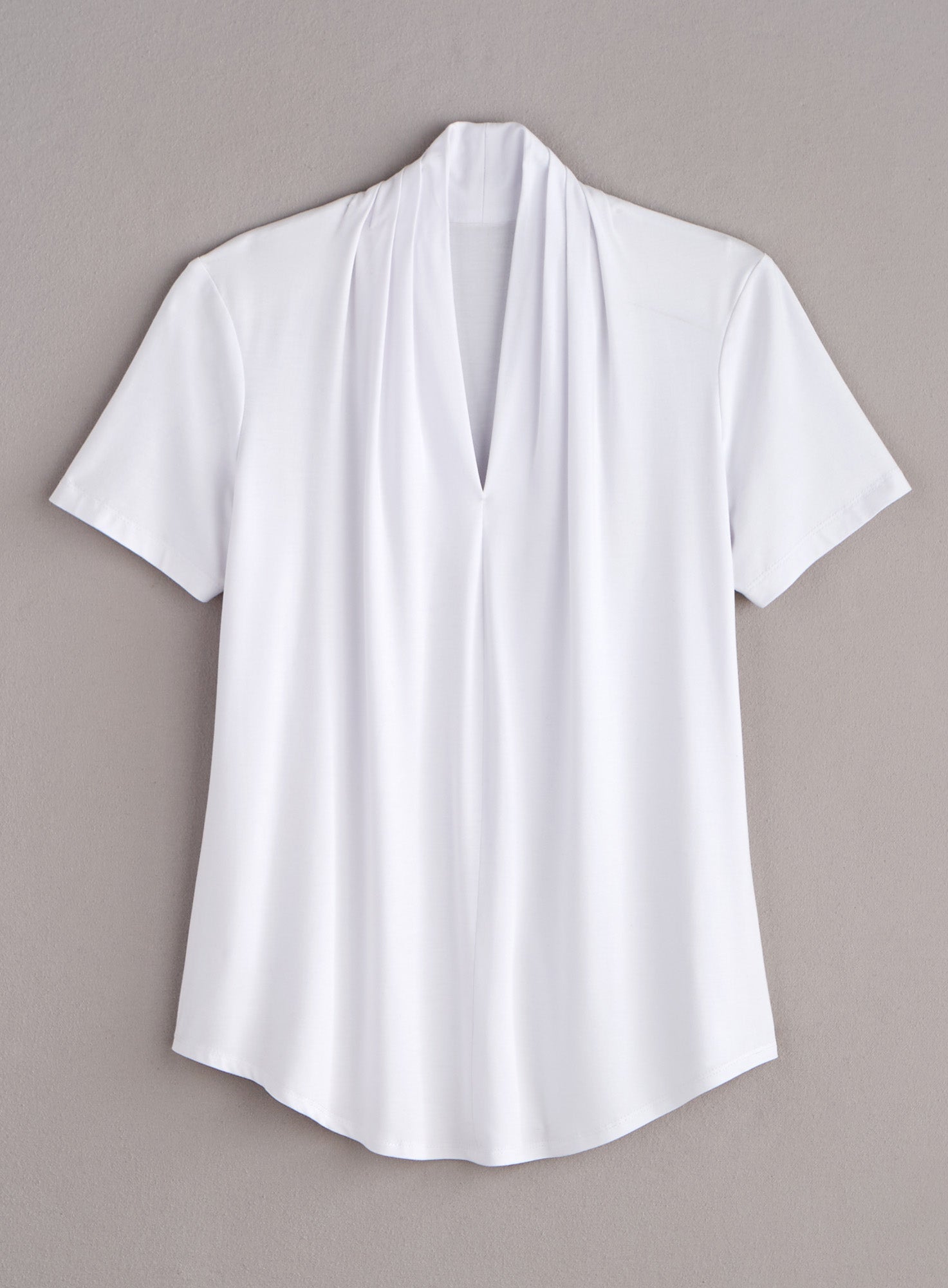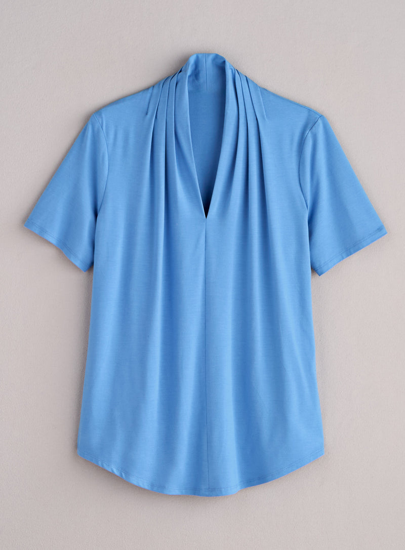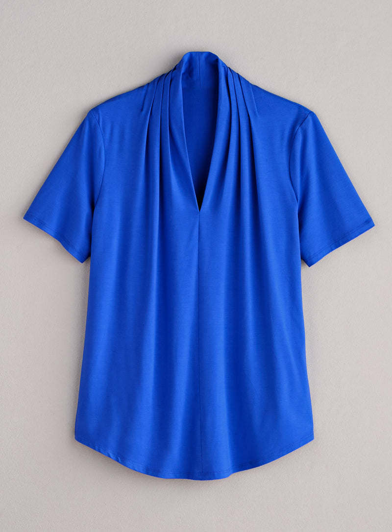 Look effortlessly polished with this easy pullover, a short-sleeve version of the original Montreal Draped Top. Soft, fluid jersey falls into a relaxed drape at the V-neck, creating a unique neckline. Features short sleeves and a gently rounded hem that hits just below the hip on most. Made in Canada in a silky viscose/spandex knit that holds its shape and stays smooth no matter how often you reach for this wear-everywhere style.