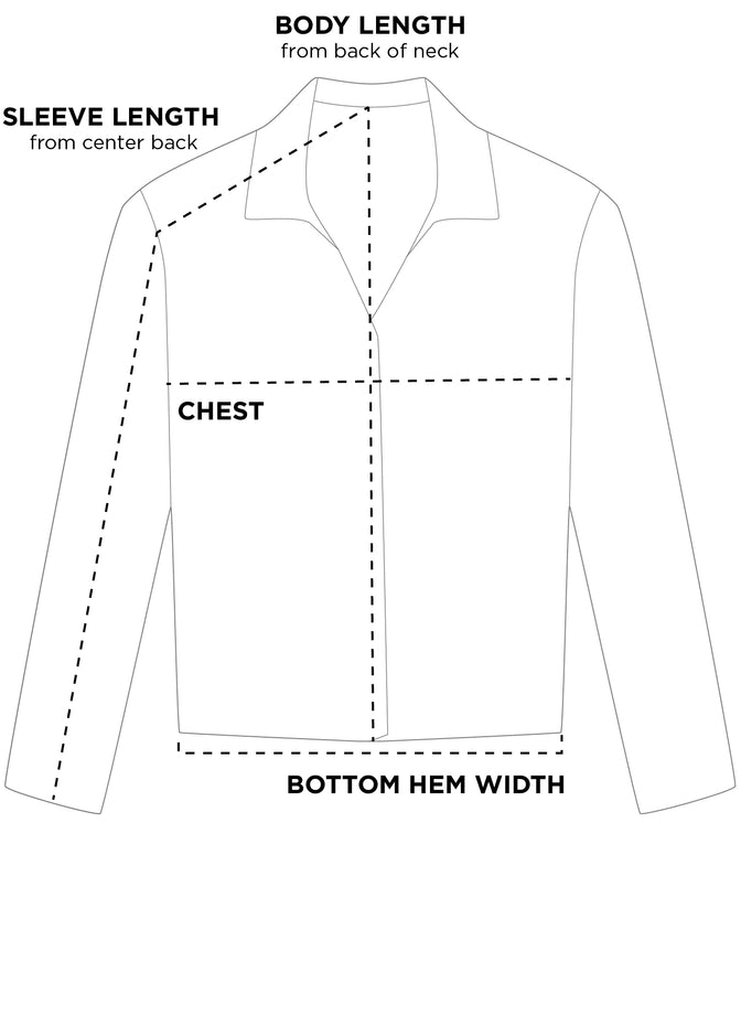 Sleeve (length from center of back) | 30" | 30 1/2" | 31" | 32" | 33" | 33 1/2" |