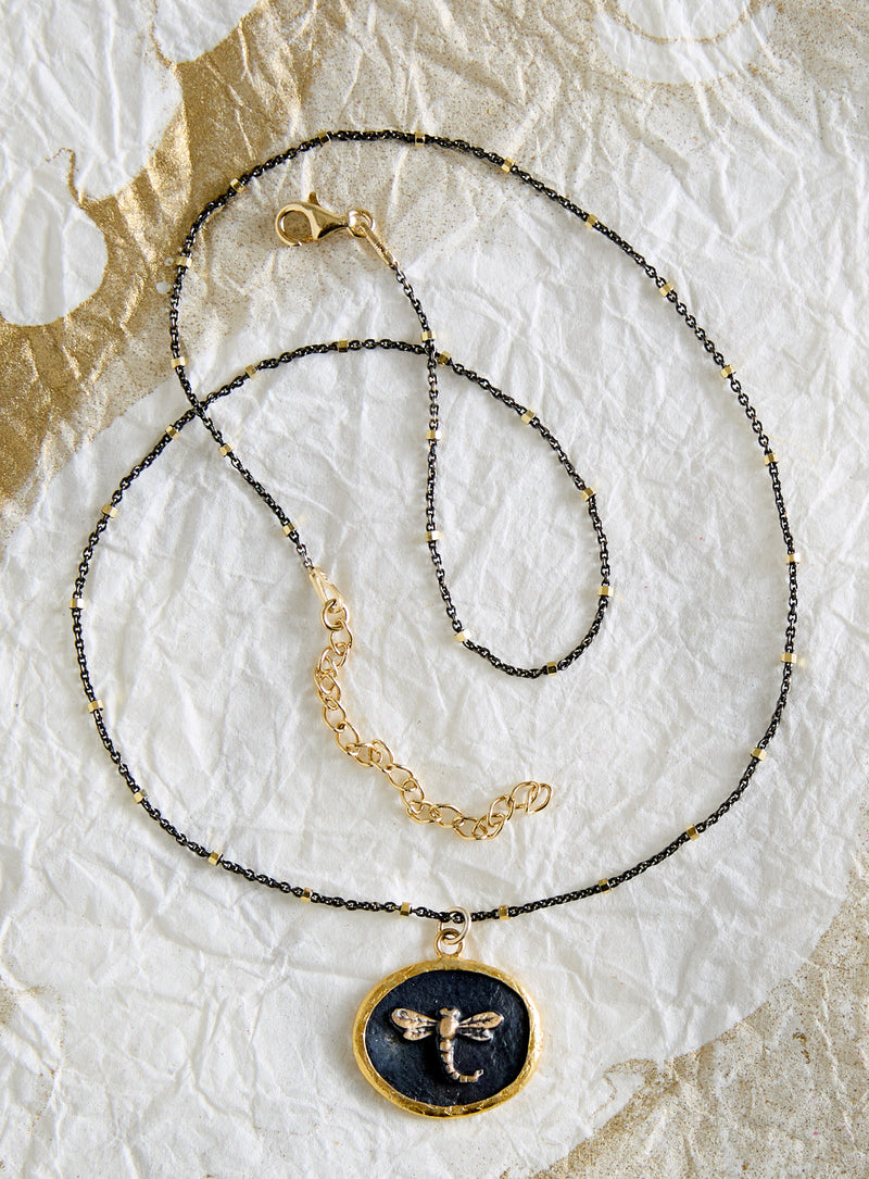 With their glittering wings and effortless grace, it’s no wonder that darting dragonflies are the source of countless legends. For us at Petalura—named for a species of dragonfly—they’re a sign of growth through transformation. After all, dragonflies spend most of their lives as nymphs before emerging into their agile, iridescent adult form. Our handcrafted dragonfly necklace is an empowering gift for any woman facing change. Which, let’s face it, is every woman. Hammered sterling silver is plated in dark rhodium with 22k gold accents and hung on an oxidized chain with 14k gold-plated bead detailing.