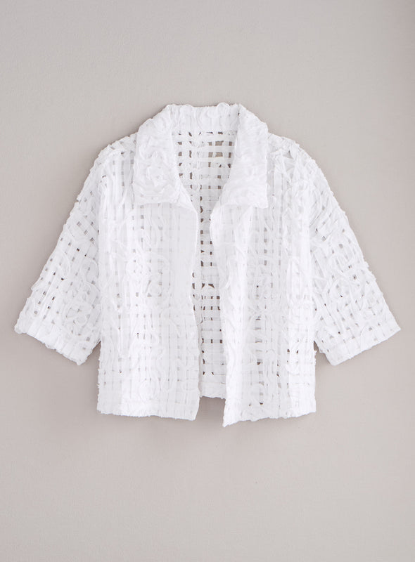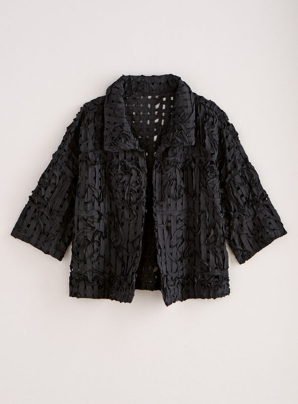Jewelry designer Ofelia Cisneros maximizes contrasts in this striking jewelry. Silicone bands connect thin slices of tagua palm nut, pairing black with white, natural with manmade, curves with corners, soft with solid, lightweight materials with a heavy hitting look.