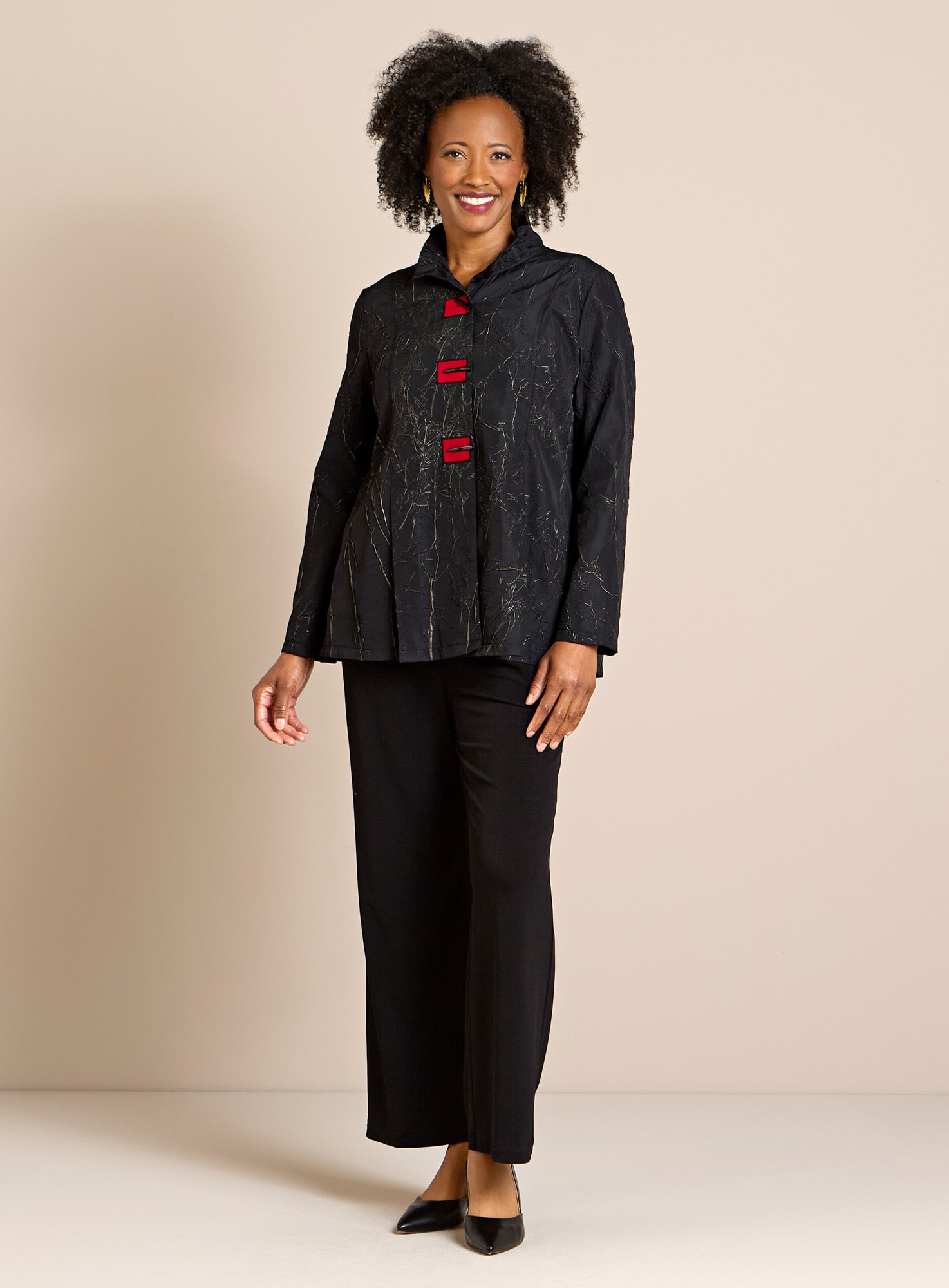 Head-to-toe black? Easy chic. Quiet gold tracery and bold pops of red? Now you're talking.
