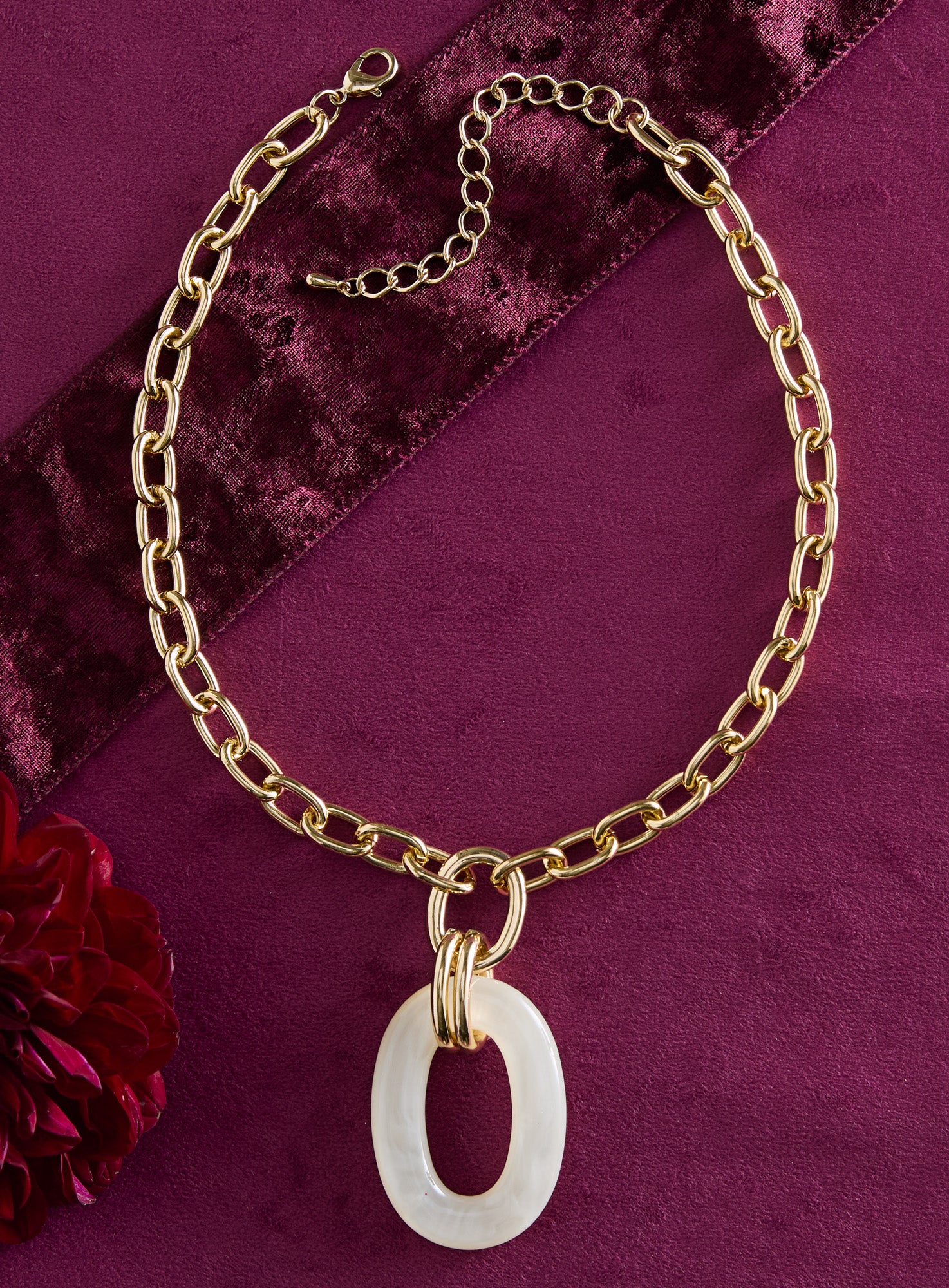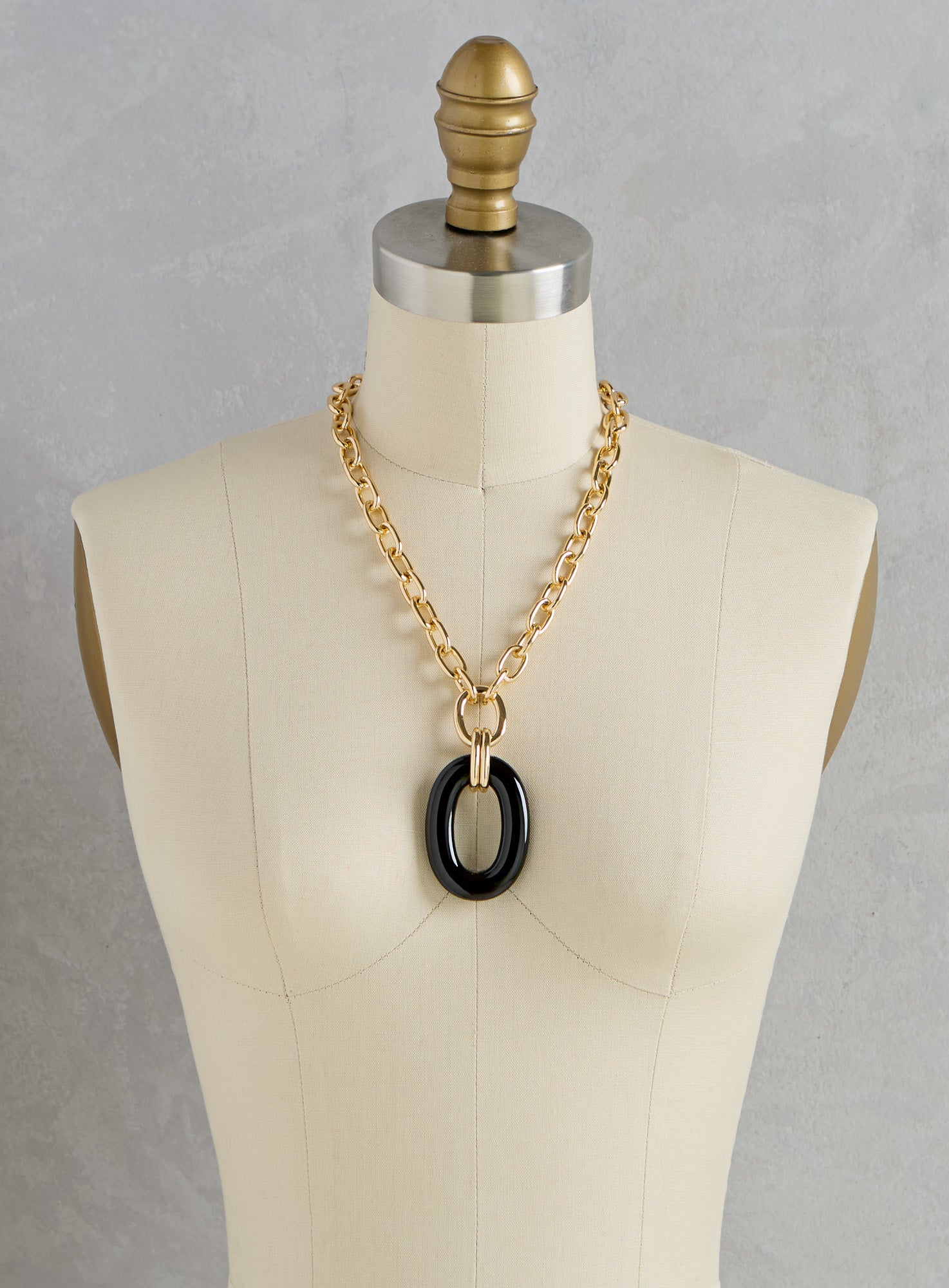 Get looped in on the statement necklace trend—minus the heft. Chunky gold-tone links lead to a glossy resin oval, bold enough to anchor your whole outfit. This simple but striking necklace may look substantial, but it’s surprisingly lightweight, so you can wear it from brunch to evening plans without a second thought. In glossy Black and Pearlized white.