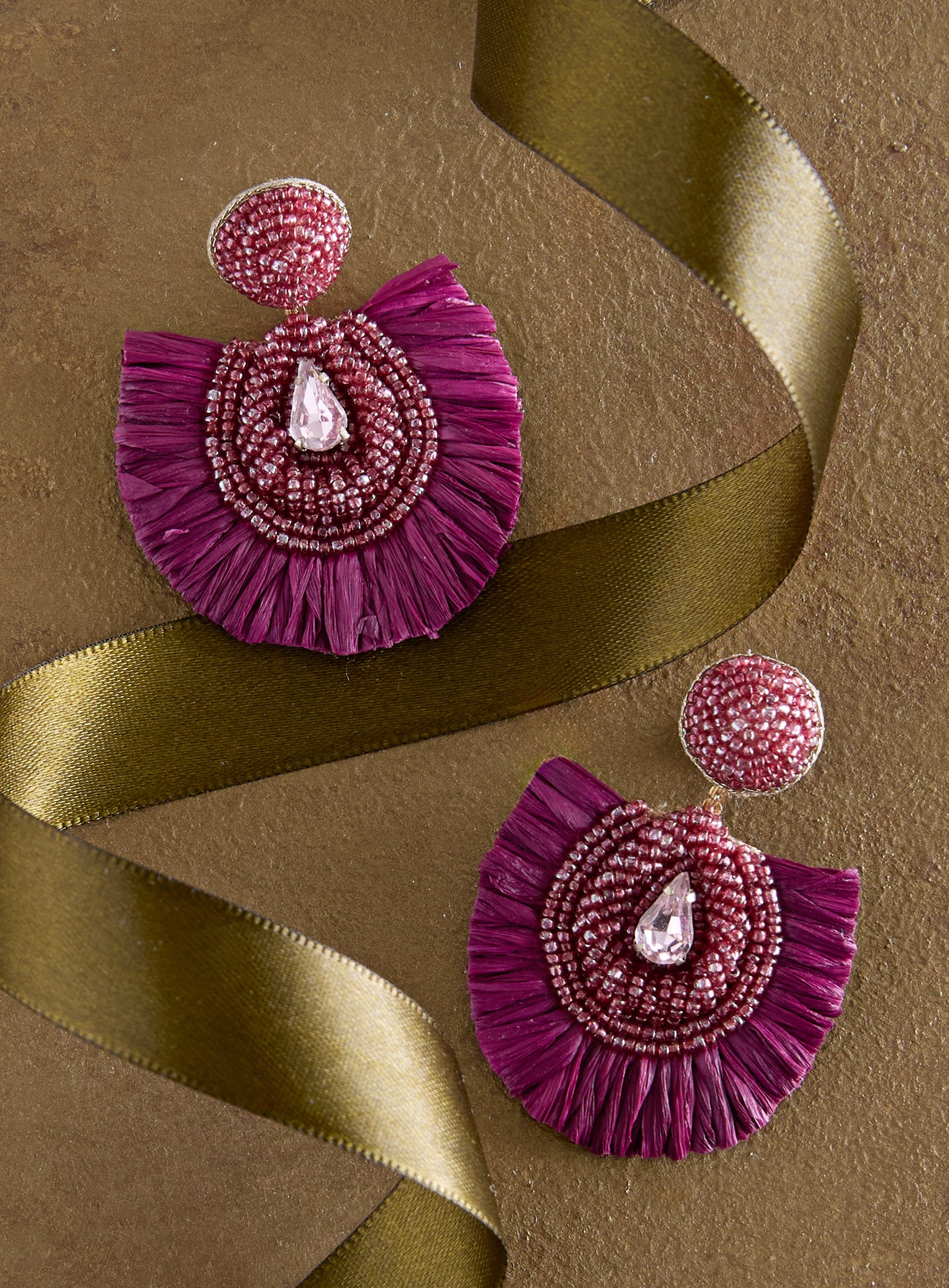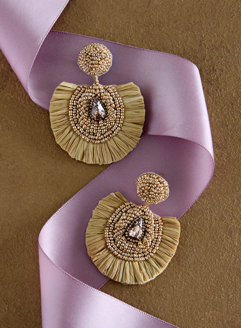 Cue the sparkle—our Midnight Gala Earrings are made for celebration season. Iridescent seed beads and a single dazzling glass crystal are framed by a fan of raffia fringe that sways with every toast and twirl. Lightweight but impossible to miss, they’re the kind of statement earrings that turn even a simple sweater into party attire.