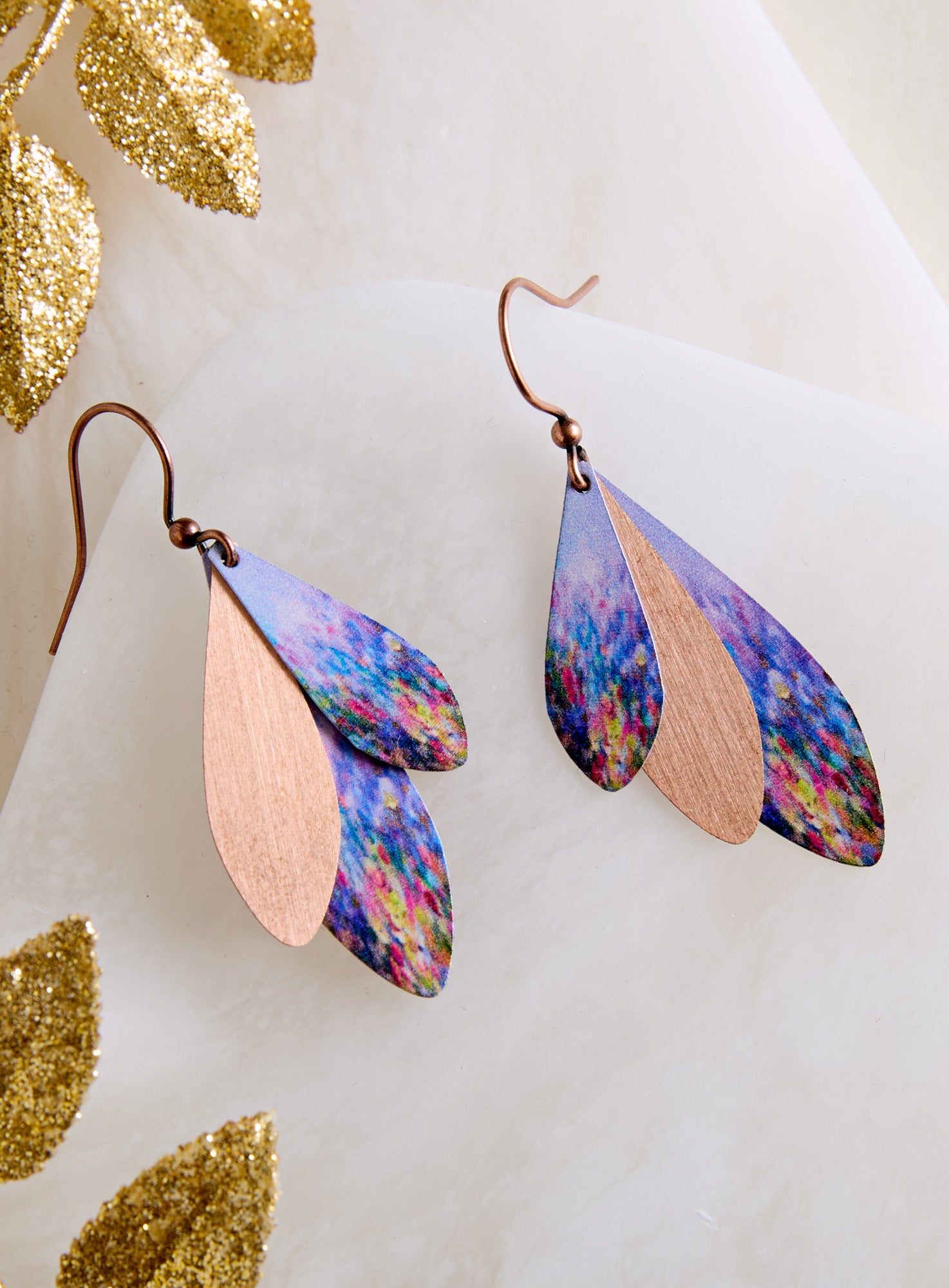 The soft light of evening settles over a wildflower meadow in these Impressionist-inspired earrings. Handcrafted in Colorado, each design is UV giclée printed on both sides of two ultra-light stainless steel petals, with a copper petal for metallic contrast. At 0.05 ounces each, you'll barely notice them—until someone complements them.